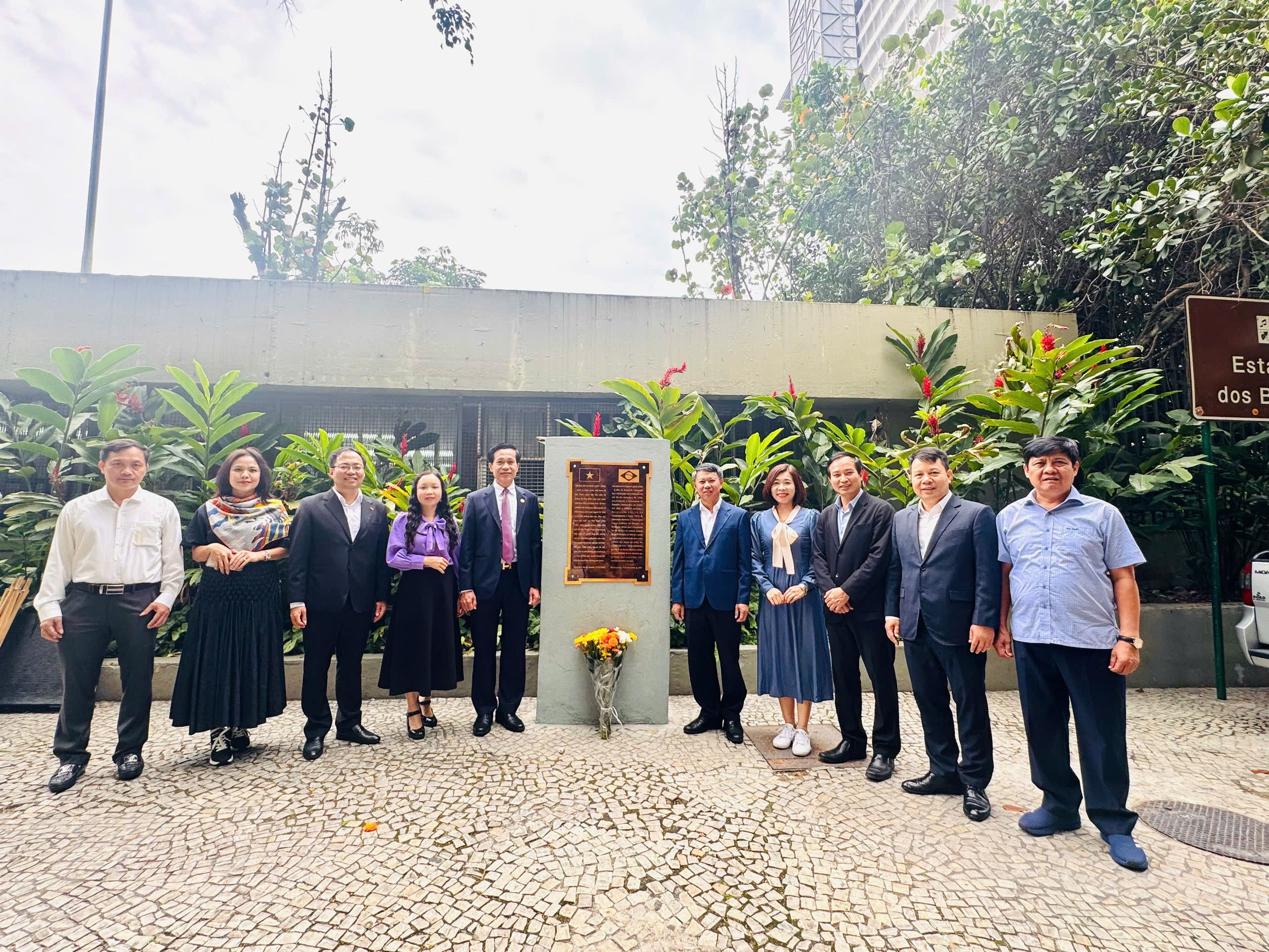Hai bên thống nhất sẽ tiếp tục trao đổi, cụ thể hóa các nội dung đã thống nhất, hướng tới xây dựng chương trình hợp tác nghiên cứu và đào tạo giữa Học viện Chính trị quốc gia Hồ Chí Minh và Viện Chính sách BRICS. Thăm bảng tưởng niệm Chủ tịch Chủ tịch Hồ Chí Minh Tại khu phố Santa Teresa, thành phố Rio de Janeiro, Đoàn công tác đã đến thăm tấm bảng tưởng niệm Chủ tịch Hồ Chí Minh - nơi ghi dấu mốc lịch sử khi Người có mặt tại Brasil năm 1912 trong hành trình tìm kiếm con đường cứu nước. Chính quyền và nhân dân của thành phố Rio cùng cộng đồng đã gìn giữ địa điểm này như biểu tượng cho tinh thần quốc tế và tình hữu nghị Việt Nam-Brasil. Tấm bảng được khắc song ngữ Việt - Bồ Đào Nha, công nhận Hồ Chí Minh là “Anh hùng giải phóng dân tộc, danh nhân văn hóa kiệt xuất của Việt Nam”, khẳng định thân thế và hành trình của Người đã góp phần vun đắp mối quan hệ hữu nghị lâu đời giữa hai quốc gia. Hình ảnh Đoàn Việt Nam dâng hoa tại nơi lưu lại dấu chân lãnh tụ không chỉ thể hiện lòng thành kính và tự hào dân tộc mà còn khẳng định sự kết nối sâu sắc về lịch sử, văn hóa và giá trị nhân văn giữa Việt Nam và Brasil.